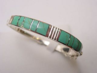 Sterling Silver bangle bracelet, it opens easily with an invisible hinge, comes with an extra clasp and security chain. Inlaid with natural Turquoise stone. Handmade.